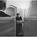 portrait einer frau durch ein schaufenster in monochrom fotografiert von anne juengling