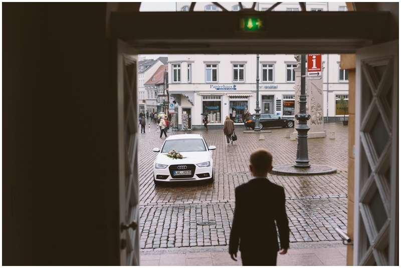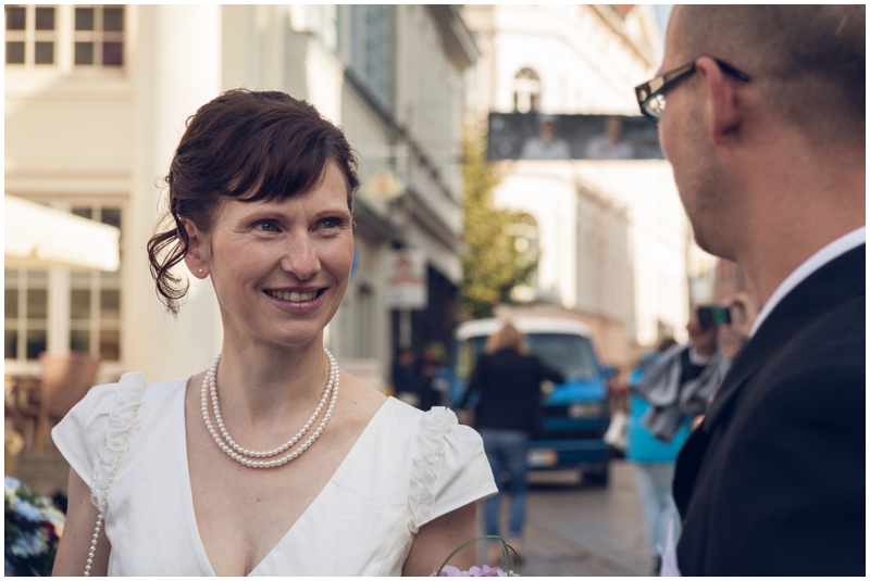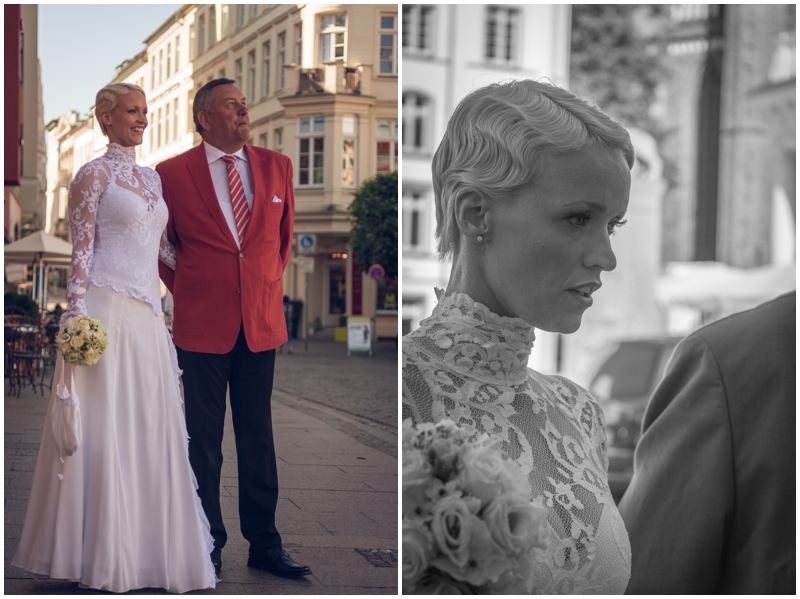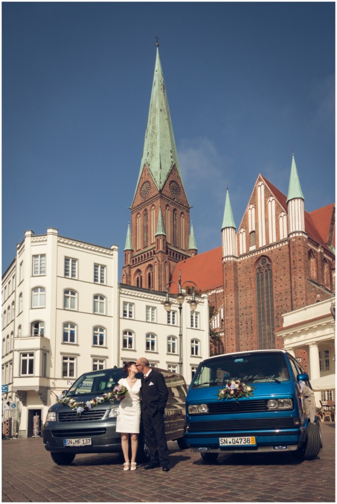 Wie bereits beim Engagementshooting geprobt, ging es nach der Trauung im Schweriner Rathaus zu Fuß durch die Stadt zum Anleger der Weißen Flotte, wo sich die Hochzeitsgesellschaft zu einer Dampferfahrt verabschiedete.